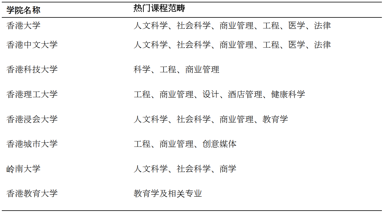 香港提供本科课程的学术机构众多,包括政府资助(UGC funded)的院校和非政府资助的院校。以下是其中一些代表性的院校及其提供的本科课程: