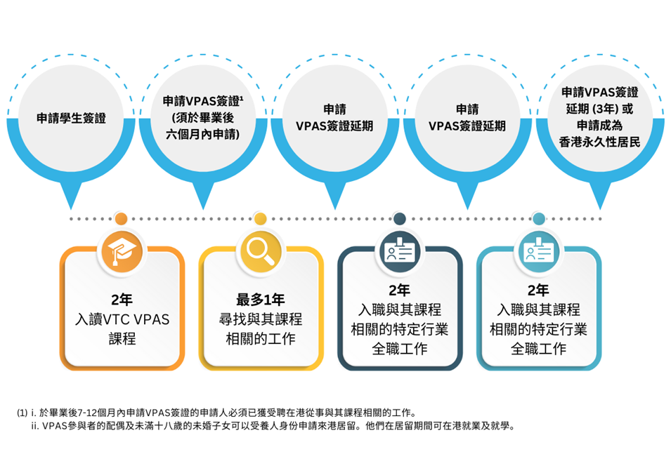 计划试行期为两年,容许2024/25学年及2025/26学年来港修读指定 VTC全日制高级文凭课程的非本地生(包括内地及其他国家/地区的学生)毕业后,申请留港工作,投身与其课程相关的专业行业,包括航空、运输及物流;创新及科技;机电工程;建筑、土木工程及建设环境;以及海事服务。